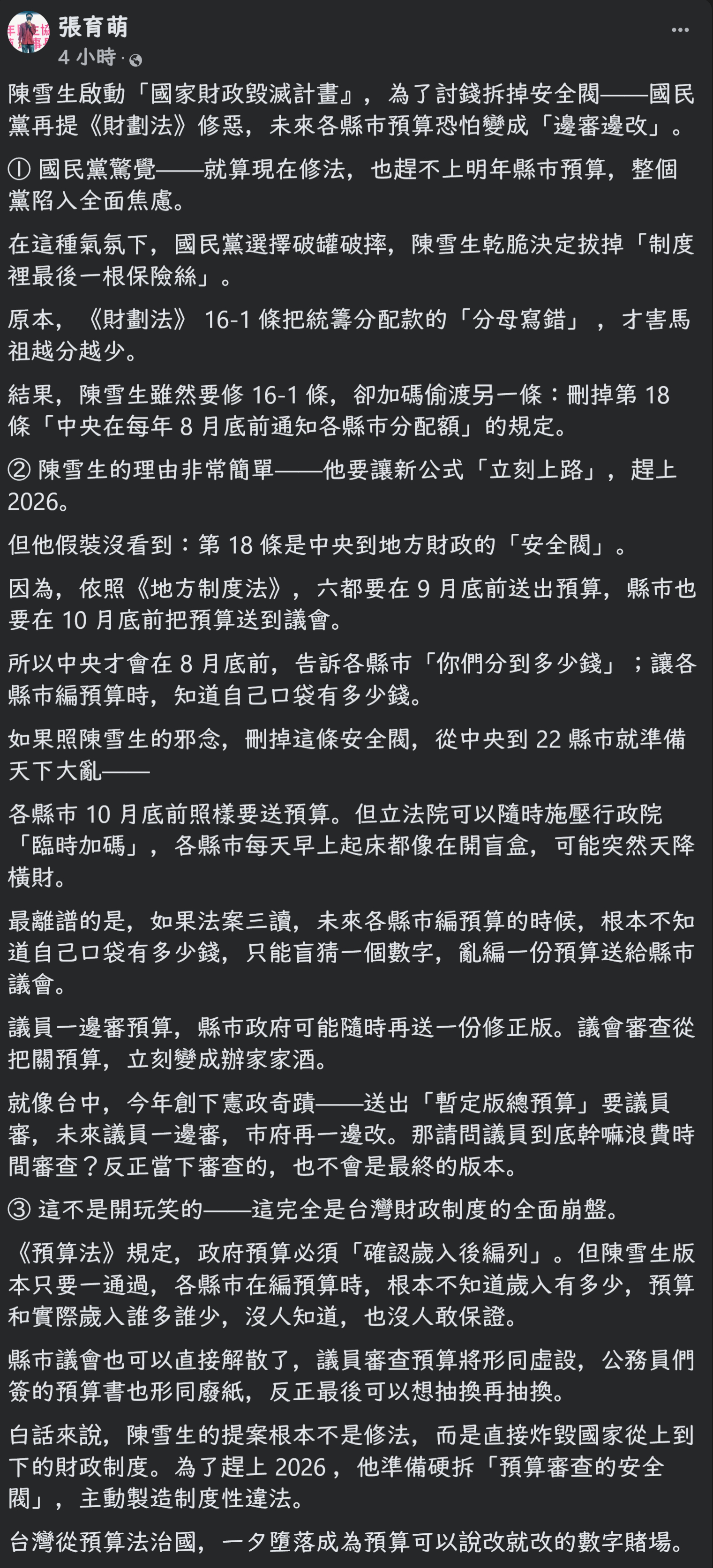 白話來說,陳雪生的提案根本不是修法,而是直接炸毀國家從上到下的財政制度。為了趕上2026,他準備硬拆「預算審查的安全閥」,主動製造制度性違法。