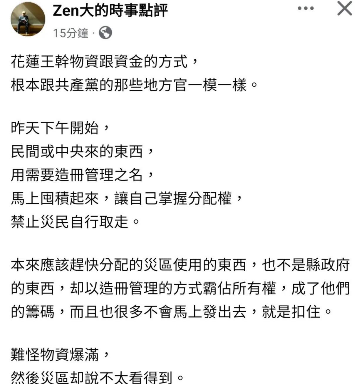 再說,最需要被物資徵信的,恐怕是花蓮縣政府自己吧。