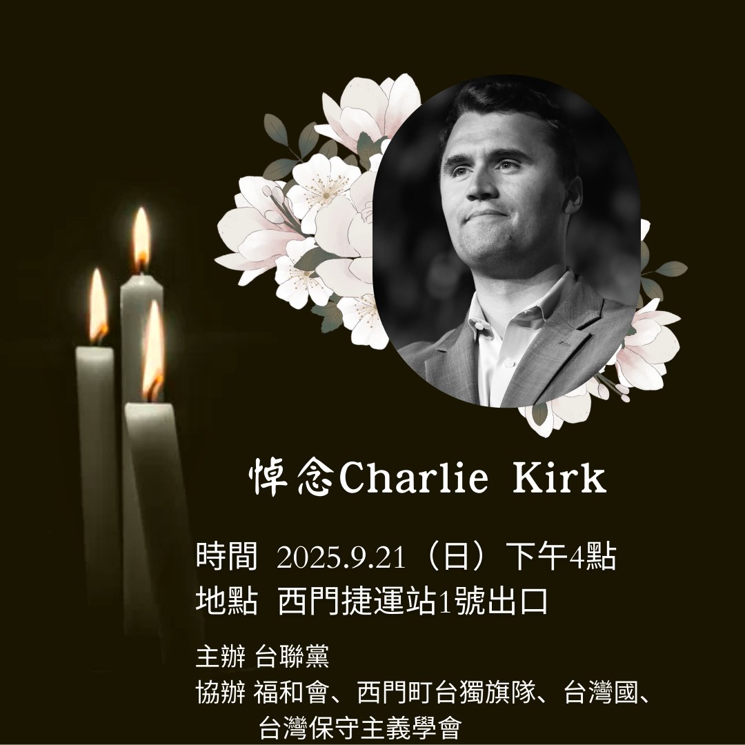 台聯黨將在9/21(日)下午4點至6點,在捷運西門站1號出口,與福和會、西門町台獨大旗隊、台灣國、台灣保守學會……等,合作舉辦「向查理柯克致敬」活動。
