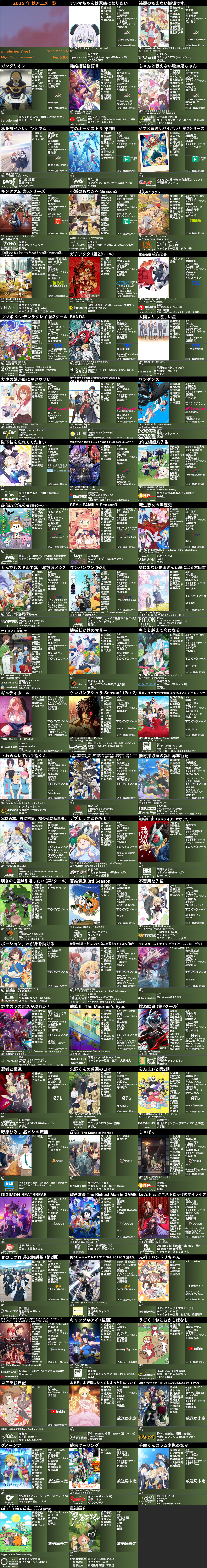 以下為巴哈姆特 GNN 整理,預定 2025 年秋季日本將在電視頻道播出的動畫新番資訊(註:動畫新番為新作動畫俗稱,包括短篇動畫)。文章介紹部分作品名稱為暫譯,首播日為官方發表電視台最早播放日期,若有更動則以官方公告為準。本篇整理並非動畫瘋秋季動畫表,動畫瘋秋季動畫請靜待官方公告。