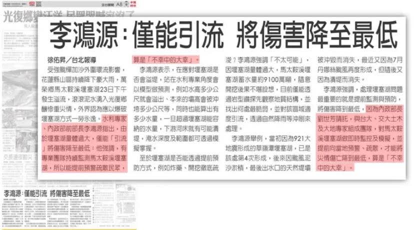 花蓮馬太鞍溪堰塞湖23日下午溢流,導致光復鄉水患災情慘重,泥濘溪水淹過市區,更釀成2人死亡、多人受傷失聯。如今洪水退去,光復鄉滿目瘡痍,國民黨立院黨團總召也列出光復鄉所需物資,呼籲社會各界協助。