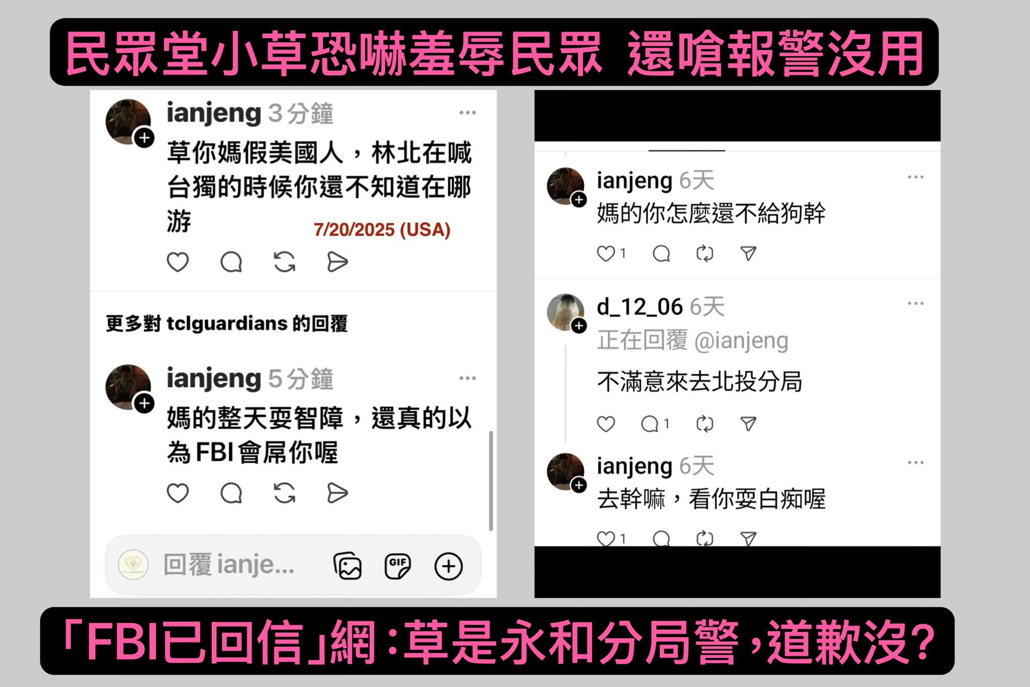各位藍白網軍你們小心了,AI造謠美台元首及國家人民安危,你們真身要被抓出來了。謝謝跟美國FBI跟AIT檢舉藍白網軍帳號的大神,FBI和AIT會直接跟meta聯繫,取得帳號背後的真實身分後回信。